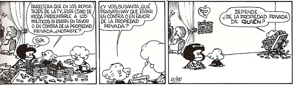 Si usted, entonces, es un defensor de la propiedad privada, tenga en consideración que las ideas no vienen solas, ni tampoco viven en la racionalidad de nuestra mente, están hechas de circunstancias históricas y habría que reconocer que toda la historia está enmarcada en una lucha entre dominadores y dominados, entre ricos y pobres, entre fuertes y débiles, de esta lucha nacen las ideas y a alguno de los dos lados sirve y apoya. La idea de la propiedad privada, por más que se justifique en el bienestar, en la libertad, en el progreso, ha servido y seguirá sirviendo para los de arriba: dominadores, fuertes y ricos.
