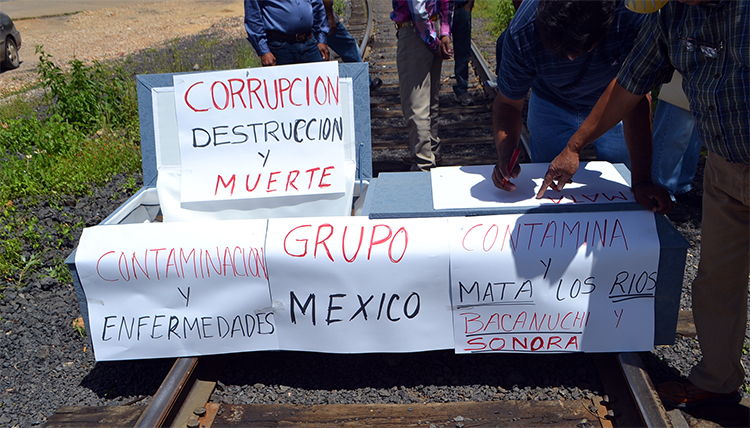 El día de ayer viernes, alrededor de medio día dábamos cuenta de que mineros miembros de la Sección 65 del Sindicato Minero Nacional, se habían aglutinado en un tramo de las vías del tren, para impedir su paso y posterior acceso a la mina, colocando un ataúd con algunas pancartas sobre las mencionadas vías.