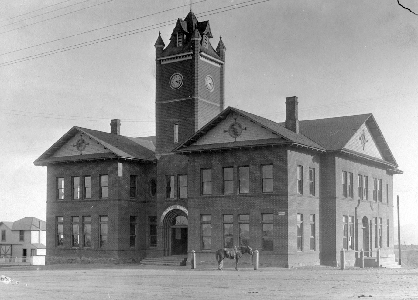 La foto muestra el original estilo arquitectónico Victoriano, mismo edificio que se incendió el 4 de diciembre de 1926, y al ser reconstruido ya no le incorporaron su hermosa estructura Victoriana.
