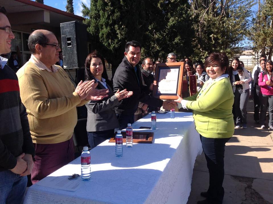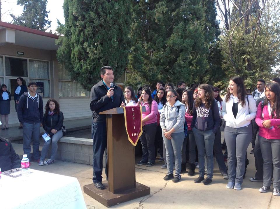 Cananea, Sonora a 14 de Noviembre de 2014.- La mañana del 13 de Noviembre, El Presidente Municipal hizo entrega de un reconocimiento a la directora del C.B.T.I.S 106 por el 38 aniversario del plantel. El Alcalde felicitó a alumnos, maestros y personal administrativo, los exhorto a que sigan poniendo el alto el nombre de su institución educativa, como lo han hecho con los buenos resultados obtenidos en la prueba enlace, el cual ganaron gracias al empeño el trabajo y dedicación de todos los que la conforman.