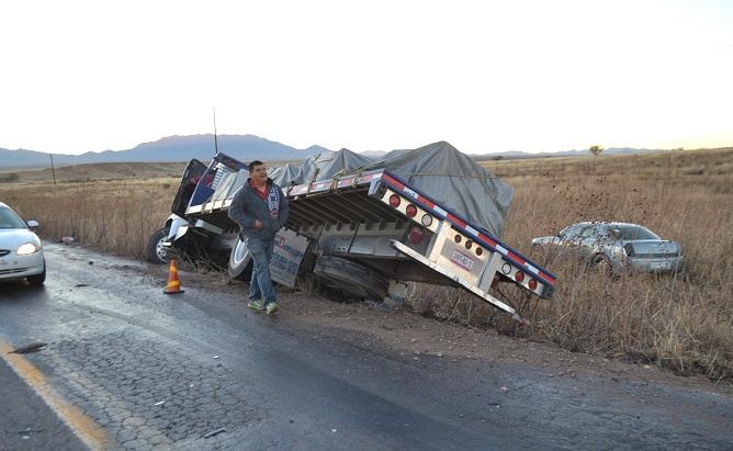 Cananea, Sonora a 30 de noviembre de 2014.- Pasadas las 5:00 de la tarde de este domingo, en la carretera Cananea a Agua Prieta, varios vehículos particulares y otros de carga, se vieron afectados por una serie de choques que se originaron después de que un carro Taurus color oro, con placas de Arizona, según versión de testigos, impactó a un Pontiac Grand Prix, mismo que al maniobrar, se impactó contra un tráiler, el cual al esquivarlo se salió de la cinta asfáltica quedando embancado a un costado.