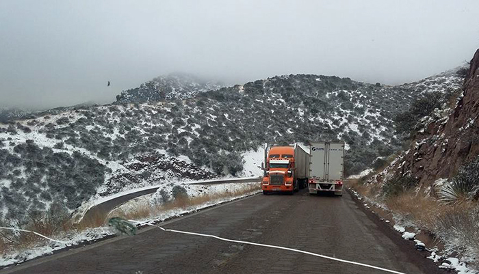Cananea, Sonora a 22 de Enero de 2014.- Tal como estaba pronosticado ya se registra una nevada en el puerto San Luis entre Agua Prieta Sonora y Janos Chihuahua, y por la tarde alrededor de las 4:00 la Policía Federal de Caminos anunció que el paso vehícular había sido cerrado.