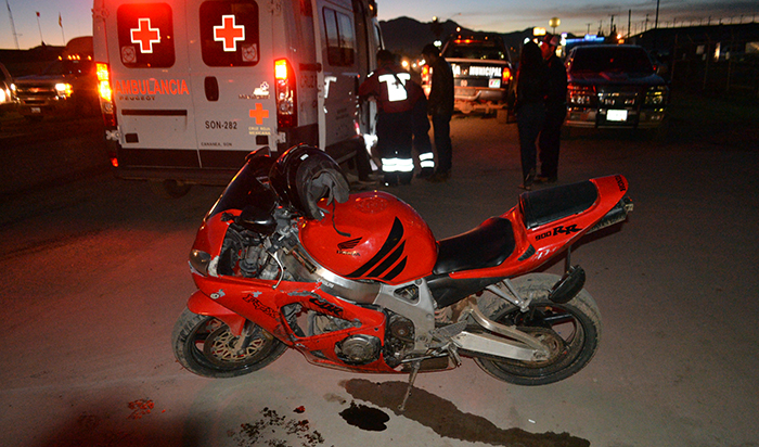 Cananea, Sonora a 03 de Febrero de 2015.- La tarde noche de este martes, el conductor de una motocicleta que transitaba por la Calle 8, fue arrollado por un vehículo Avalanche color azul con rines de lujo, el cual después de pasarse el semáforo en luz roja, impactó dicha motocicleta.