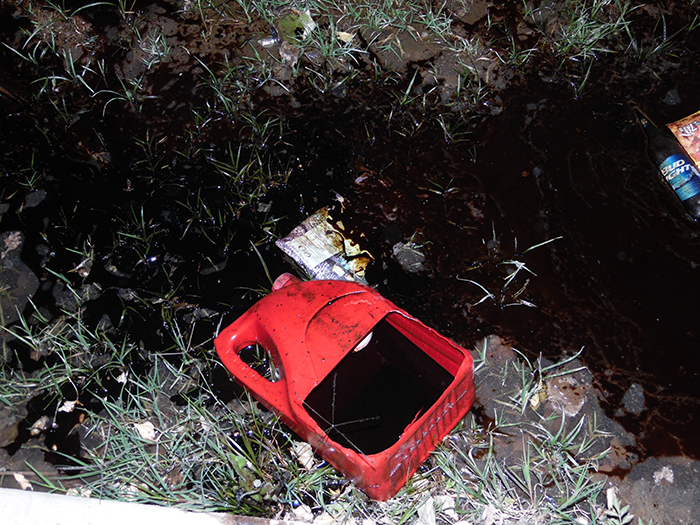 Evidentemente, con toda alevosía el derramamiento de aceite se dio al darle servicio a algún vehículo, sin la mínima precaución, incluso, el recipiente del combustible también se dejó tirado en el lugar.