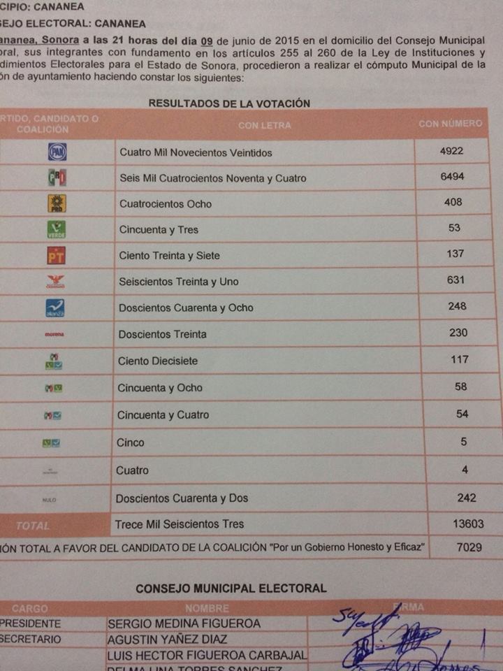 Cananea, Sonora a 09 de Junio de 2015.- Alrededor de las 10:00 de la noche de este martes, el Lic. Fernando Herrera Moreno, quien encabezó el proyecto político del PRI-PVEM-PANAL, recibió la Constancia de Mayoría que lo acredita como el vencedor de la pasada contienda por la Presidencia Municipal de Cananea, donde obtuvo un total de 7029 votos a su favor, seguido por el Candidato del PAN Juan Molina Álvarez, quien obtuvo 4922 sufragios a su favor, Adolfo Armenta de Movimiento Ciudadano con 631 votos, Abelardo Rodríguez con 408 votos, Carlos Navarrete con 230 y Emanuel De la Torre con 137 votos.