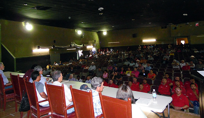 Cananea, Sonora a 30 de julio de 2015.- A la vuelta de 8 años de haber iniciado el movimiento de huelga, mineros de la Sección 65 del Sindicato Minero Nacional, realizaron una protesta en el Cine Teatro casa del Minero, a donde se dieron cita líderes no solo de este gremio a nivel local, sino de secciones hermanas, mineros retirados, así mismo, de otras organizaciones sindicales del Estado de Sonora, líderes y pobladores del Río Sonora, además de la presencia de la Investigadora Dra. Reyna Castro, quién ha realizado un estudio de impacto ambiental y de salud, generado al Río de Sonora y a su población después del derrame de Tóxicos efectuado al afluente del río en Agosto de 2014.