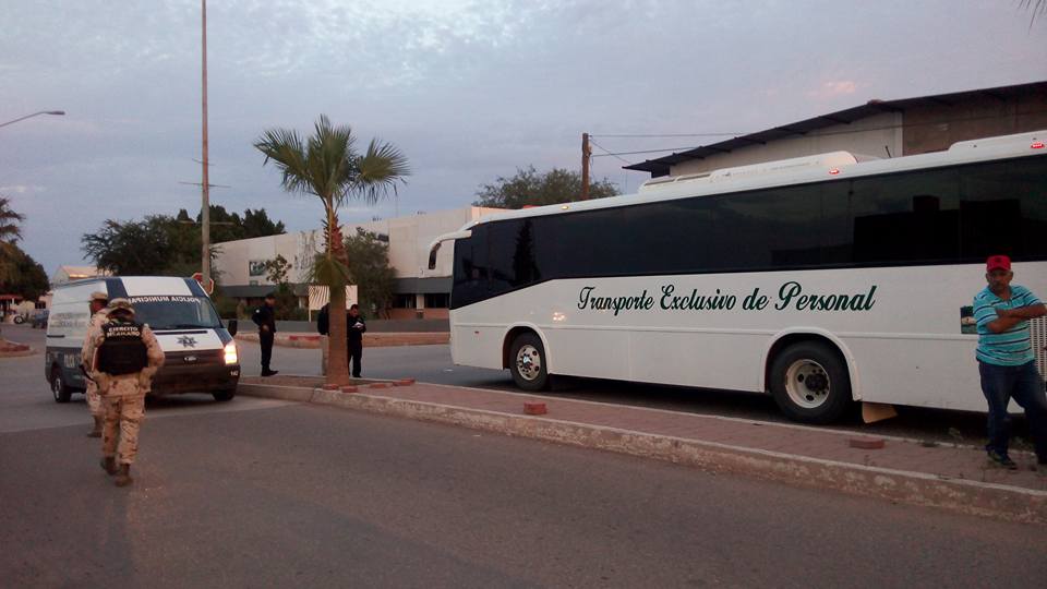 Caborca, Sonora a 07 de Septiembre de 2015.- Un camión que transporta personal a la minera Fresnillo acaba de ser baleado cuando transitaba sobre la calle Obregón entre las avenidas Antimonio y «W» cuando era conducido por Juan Salazar Martínez, de 58 años de edad quien resultó ileso en la agresión armada, al igual que el personal que transportaba a bordo del camión.