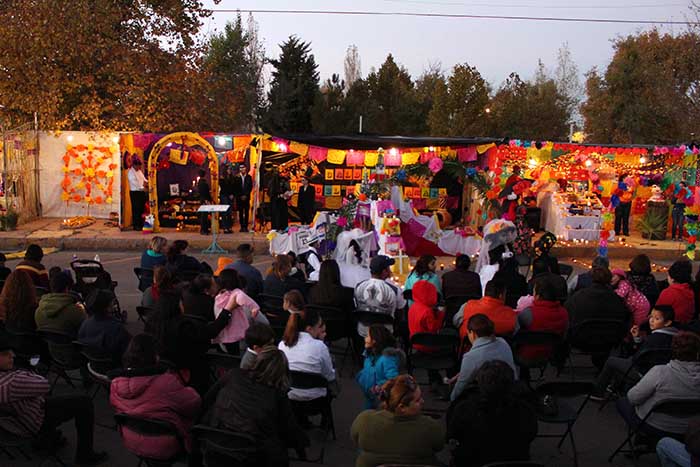 Cananea, Sonora a 05 de Noviembre de 2015.- La noche de este jueves 5 de noviembre se vivió una cautivadora noche de muertos en la Ave. Juárez, frente a Palacio Municipal, llena de color y tradición. A partir de las 4:00 de la tarde las escuelas participantes en el concurso de Altares de Muertos, expusieron lo que es un tradicional altar en honor a los difuntos, con las típicas comidas que gustaba, sus fotografías, manteles y adornos coloridos, las frutas de temporada y dulces mexicanos.