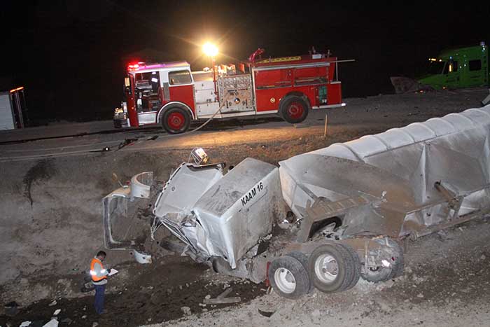 Cananea, Sonora a 05 de Noviembre de 2015.- Alrededor de las 9:00 de la noche de este miércoles, un trágico accidente se suscitó en el kilómetro 106 de la Carretera Cananea a Imuris, justo en el poblado de Cuitaca, donde participaron una pipa que transportaba aproximadamente 40 toneladas de cal propiedad de la empresa Kaam International Transport de Coahuila y un vehículo sedan Ford Fiesta de reciente modelo.
