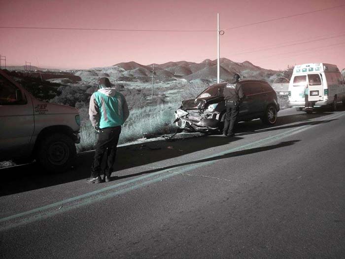 Cananea, Sonora a 03 de diciembre de 2015.- Alrededor de las 8:00 de la mañana de este jueves, un nuevo choque carretero se registró en el Kilómetro 84 de la Carretera Cananea a Imuris, donde participaron una Vagoneta propiedad de la empresa TEP Transporte Especial de pasaje y una camioneta de la marca Honda.