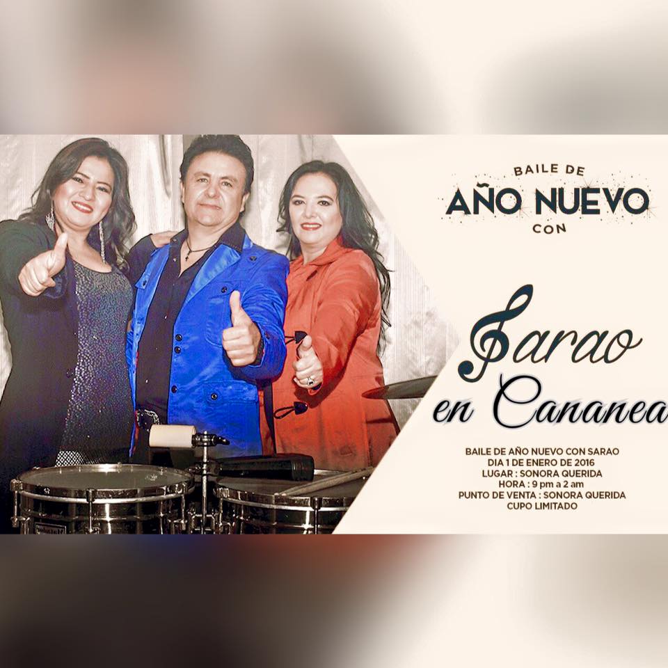 – Este próximo día Primero de Enero de 2016, para recibir el año con el mejor ambiente, el grupo musical SARAO está invitando al Baile de Año Nuevo que se llevará a cabo en el Salón de Eventos Sonora Querida.