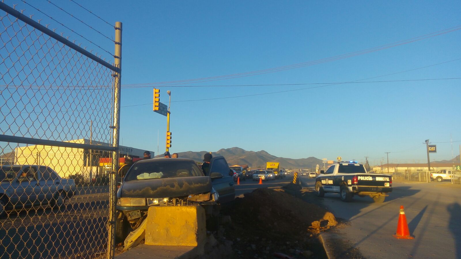 Cananea, Sonora a 19 de Enero de 2015.- Alrededor de las 8:00 de la mañana de este martes, un accidente vial se generó en la prolongación del Boulevard Lázaro Gutiérrez de Lara y Calle Aurelio Rodríguez, cuando el conductor de un vehículo de marca Mercury con placas del estado de Sonora, perdió el control de la unidad para impactarse contra la base de un semáforo.