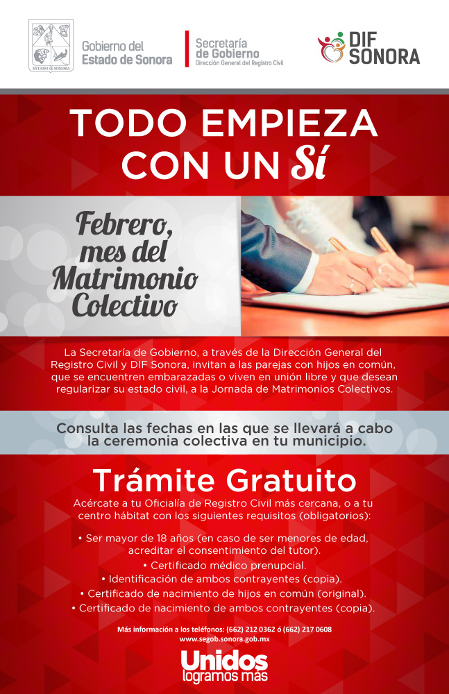 Cananea, Sonora a 08 Febrero, 2016.- Con el objetivo de regularizar a las parejas por medio de la figura del matrimonio brindándole una certeza jurídica en beneficio de las familias que tienen hijos en común, que se encuentren están embarazadas y/o viven en unión libre, el Estado y el Municipio de Cananea invitan a quienes deseen dar este paso tan importante del matrimonio y así proteger su familia.