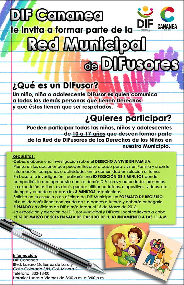 Pueden participar todas las niñas, niños y adolescentes de 10 a 17 años que deseen formar parte de la Red de DIFusores de los Derechos de los Niños en nuestro Municipio.