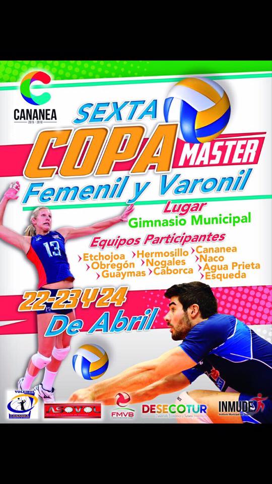 Este fin de semana los días 22, 23 y 24 de abril será cuando se lleve a cabo la copa master en el Gimnasio Municipal de Cananea, en entrevista para Soy Cobre el presidente de la Liga Municipal de Voleibol y entrenador del equipo femenil informo que la ceremonia de inauguración será el día Sábado 23 a las 12 de la tarde aunque los encuentros comenzaran desde el día Viernes continuando el Sábado para ya el Domingo jugar las semifinales y final para después darse la premiación y la clausura de la Sexta Copa Master de Voleibol.