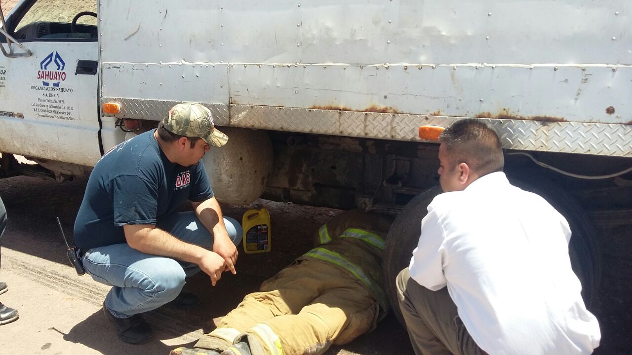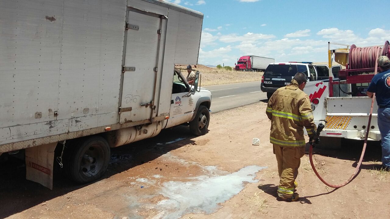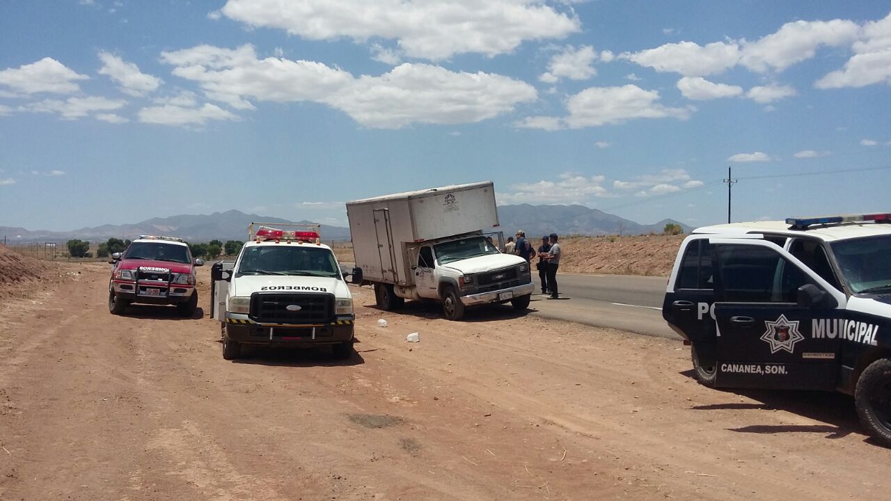 Cananea, Sonora a 19 de Mayo de 2016.- Poco antes de las 12:00 de mediodía, un carro tipo Tonelada propiedad de la empresa Sahuayo que transportaba fruta sobre la carretera Cananea a Agua Prieta, estuvo a punto de prenderse en llamas sobre el kilómetro 68, cuando presentó un desperfecto en el escape, lo que originó chispas que encendieron la base de madera de la caja de carga.
