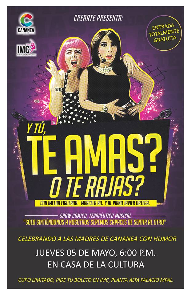 Cananea, Sonora a 02 de Mayo de 2016.- El Ayuntamiento de Cananea a través del Instituto Municipal de la Mujer, está invitando a todas las mamás al gran Show cómico terapéutico ¿Y tú, te amas o te rajas?, que protagonizan Imelda Figueroa, Marcela Ro y al piano Javier Ortega.