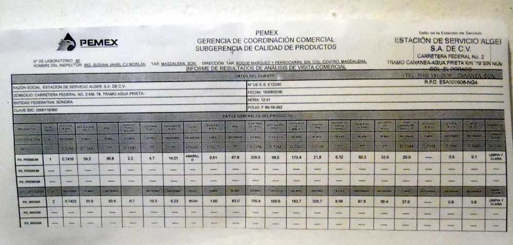 Las pruebas de laboratorio, fueron realizadas por la Química número 86 de PEMEX Ing. Susana Jahel Cu Morlán, quién rindió un informe de resultados del análisis que derivó en que tanto la gasolina Magna como Premium que surte la gasolinera están dentro de los estándares normales.