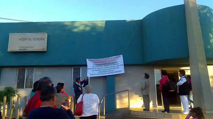 Cananea, Sonora a 26 de octubre de 2016.- Este miércoles pasadas las 6:30 de la mañana, trabajadores del extinto hospital del Ronquillo, que fue clausurado el 16 de Abril de 2015, pero cuya operación se absorbió desde 2008 de parte de la Secretaría de Salud, tras el problema obrero-laboral que permeaba en la empresa minera entonces Mexicana de Cananea, los trabajadores del nosocomio, se vieron inmersos en una situación laboral incierta, la cual prevalece hasta la fecha donde aseguran, siguen trabajando sin una basificación, por lo que exigen a quién corresponda, ser contratados como empleados de base de la propia Secretaría para poder así, gozar de los beneficios conducentes, como es aspirar a su jubilación.