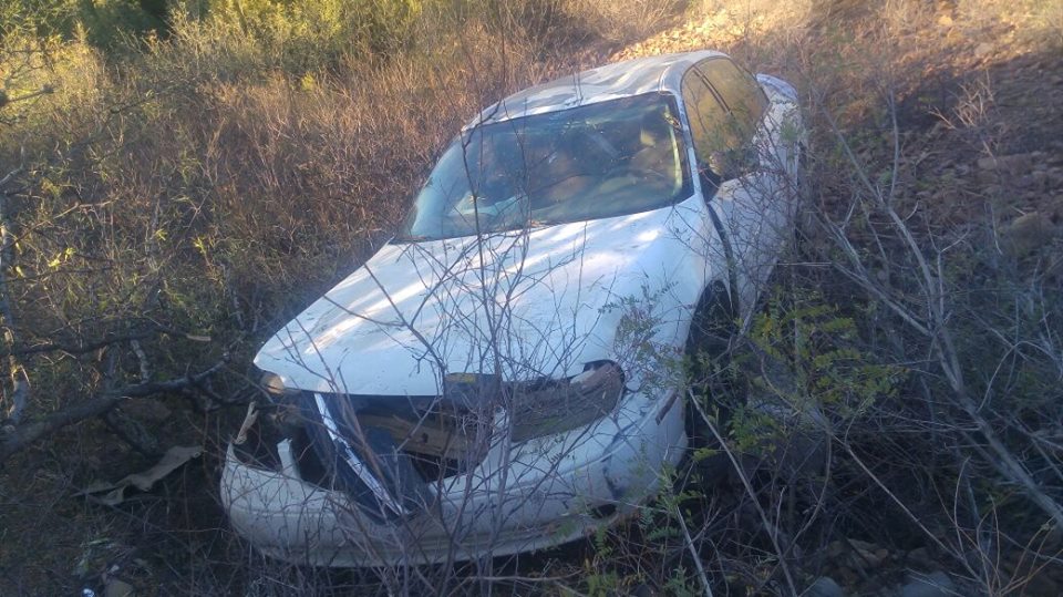 Cananea, Sonora a 09 de Diciembre de 2017.- La mañana de este jueves un vehículo de la marca Ford Malibu, desbarrancó más de 30 metros, cuando circulaba en la carretera Cananea a Ímuris y la conductora se encandiló con los rayos del sol, perdiendo el control de la unidad.