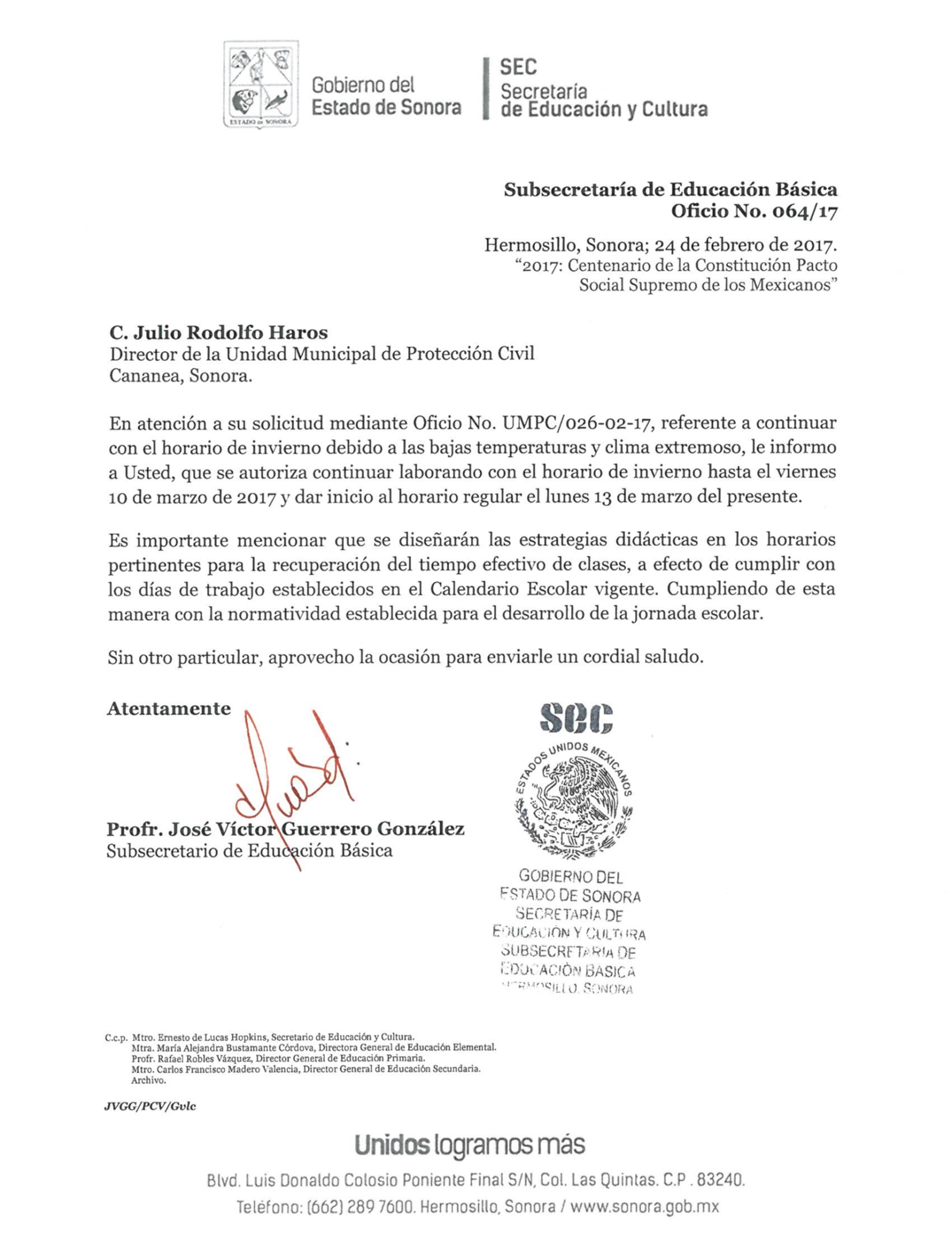 – La Delegación de la Secretaría de Educación en la región y la Dirección de Protección Civil Municipal, confirmaron que se autorizó para Cananea una prórroga del horario de invierno para la entrada a clases en nivel básico, por lo que se extiende hasta el próximo 10 de marzo el mencionado horario de invierno y se iniciará horario de verano el día 13 de marzo.