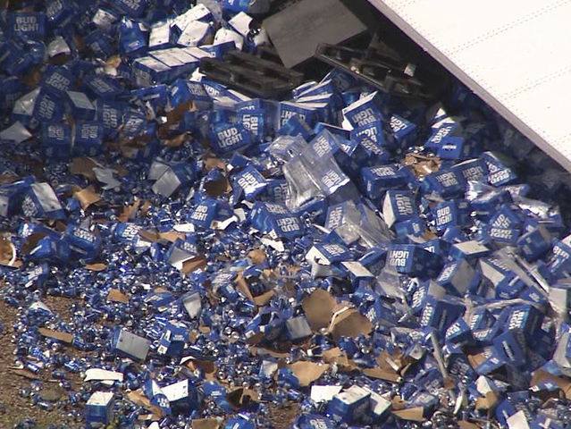 Tempe, Arizona, a 07 de Junio de 2017.- Este miércoles en la ciudad de Tempe, Arizona, volcó un trailer de la empresa Bud Light, provocando que miles de latas de cerveza quedaran esparcidas en el lugar.