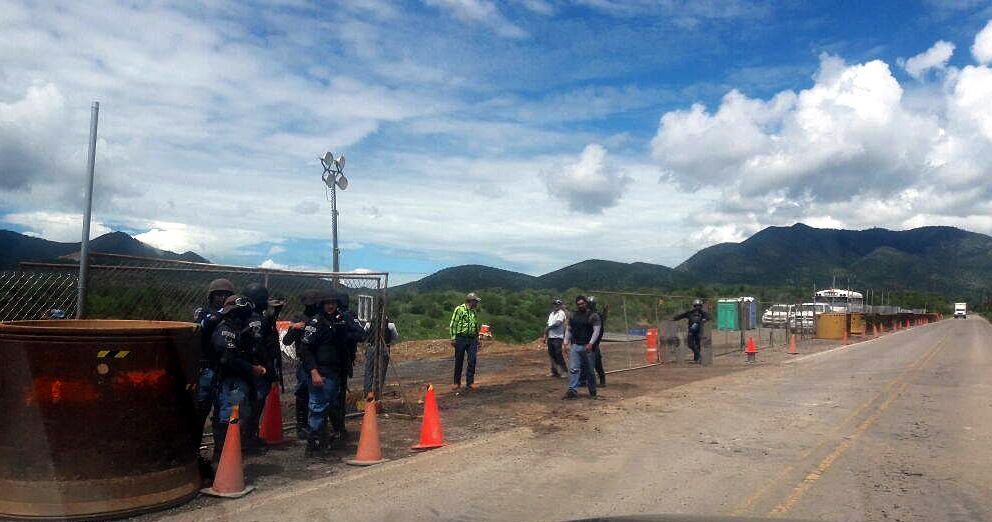 Los manifestantes requirieron la presencia de Policía Federal Preventiva, quienes arribaron al lugar y exigieron a seguridad de mina retirarse de la carretera federal y permitir el flujo de los viajeros.