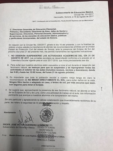 Cananea, Sonora a 20 de Agosto de 2017.- Este domingo la Sub Secretaría de Educación Básica emitió una circular con número 031/2017, donde instruye a los Directores de educación elemental, primaria y secundaria de escuelas públicas y privadas a suspender o reprogramar todas las actividades que se pretendan realizar al exterior de las aulas (incluidos recesos, recreos y descansos), desde las 9:00 am hasta las 12:00 hrs, de este lunes 21 de Agosto, donde se estará presentando el fenómeno de eclipse solar. Esta información a su vez, fue corroborada como oficial por el Delegado Regional de la Secretaría de Educación Lic. Arturo Campoy.