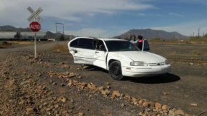 Cananea, Sonora a 15 de noviembre de 2017.- Aproximadamente a las 11 de la mañana de este miércoles, el conductor de un vehículo de la marca Chevrolet Lumina, modelo atrasado, intentó ganarle el paso a la máquina locomotora 3704, propiedad de Ferromex, cuando ambos circulaban a la altura del crucero ubicado en el barrio “La Estación”.
