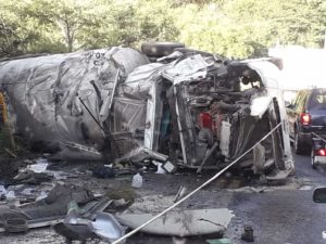 Ures, Sonora a 29 de Octubre de 2018.- Un tractocamión que transportaba alrededor de 40 mil litros de diésel, esta mañana sufrió una volcadura sobre la carretera Ures-Mazocahui y hubo derrame de combustible hacia el Río Sonora.