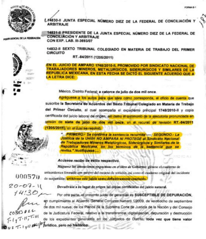 De nueva cuenta, el Sindicato Minero recurrió la determinación del Juez Federal ante un Tribunal Colegiado, el cual, una vez más resolvió que dicho Sindicato carecía de razón jurídica y confirmó la negativa del amparo y con ello quedó firme la resolución de la JFCA que determinó que la huelga que se inició el 30 de julio de 2007, carecía de materia y ordenó el archivo del expediente de amparo como asunto totalmente concluido.