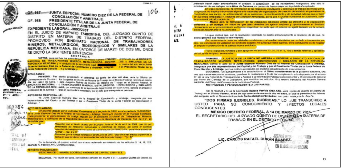 Inconforme con esta determinación, el Sindicato Minero, una vez más, recurrió, sin éxito, ante diversas instancias del Poder Judicial de la Federación, y al respecto, el Juzgado Quinto de Distrito en Materia de Trabajo entonces en el Distrito Federal, determinó negar el amparo interpuesto por dicho Sindicato como se ve a continuación:
