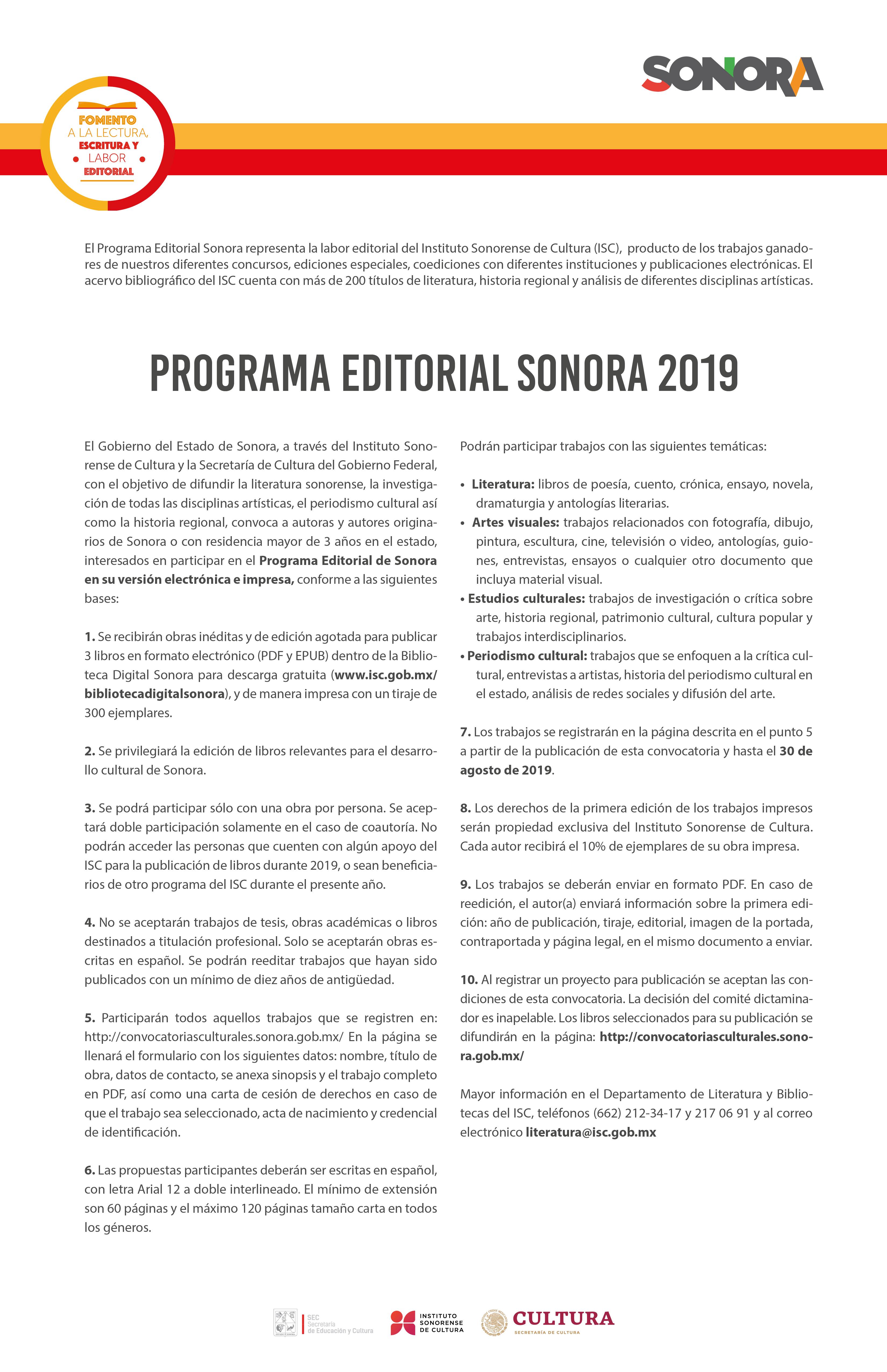 Hermosillo, Sonora, junio 17 de 2019.- El Instituto Sonorense de Cultura (ISC), invita a escritoras y escritores sonorenses, cualquiera que sea su lugar de residencia, así como autores no sonorenses con residencia en el estado mayor a tres años, a publicar su obra a través de una nueva plataforma de convocatorias más segura, sencilla y accesible.