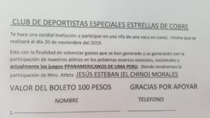 Así mismo, se está llevando a cabo una rifa a cargo de los miembros del Club de deportistas especiales «Estrellas del Cobre», de cual Jesús Esteban es miembro y quienes también buscan a través de esta actividad, brindar el respaldo económico para el atleta que ha destacado en lanzamiento de jabalina.