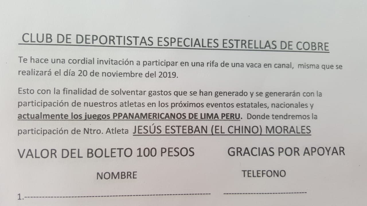 La rifa se trata de una vaca en canal, a celebrarse el 20 de noviembre donde el costo del boleto es de $100 (cien pesos) y se puede adquirir con familiares y amigos de los deportistas «Estrellas del Cobre.