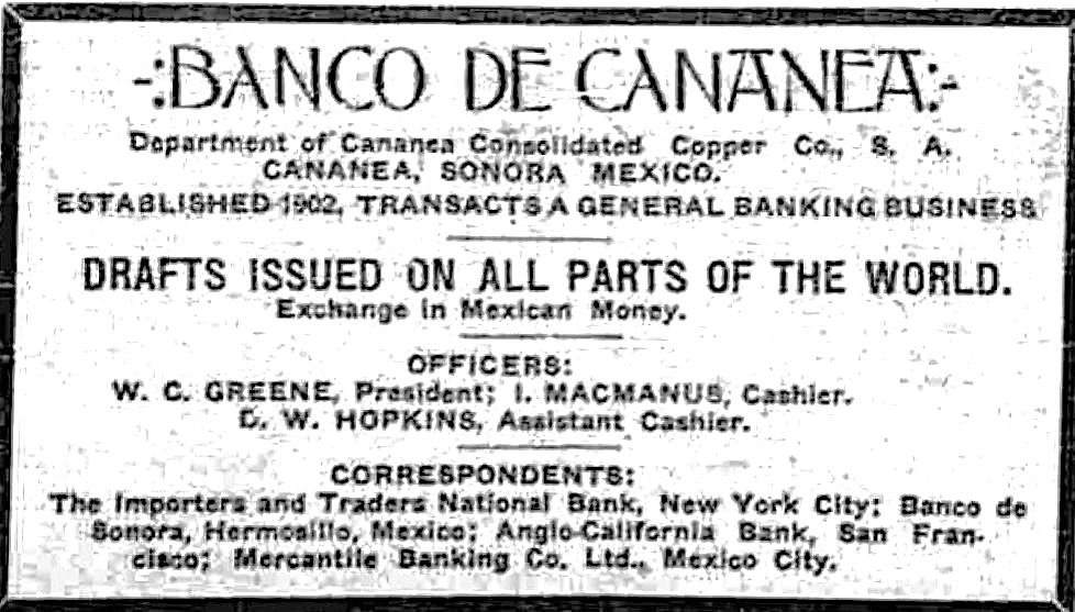 “Estuvimos viendo a los hermanos Greene entrar y salir de la oficina privada de la gerencia del banco, sus pasos lentos, sus rostros que no reflejaban alegría, pues salían de finiquitar probablemente su última transacción en Cananea, el traspaso de sus Acciones que los amparaba como propietarios del Capital Social del Banco, al comprador de las mismas: el Sr. Andrés O. Córdoba R.”