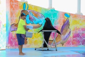 Acompañada de Bibiana Suárez Ríos, directora del centro, informó que gracias al entrenamiento que ha recibido la cría de delfín “Moana”, nacida el año pasado en el lugar, se podrá recibir a mayor número de paciente más, ya que para el 2020 se trabajará con cuatro delfines.