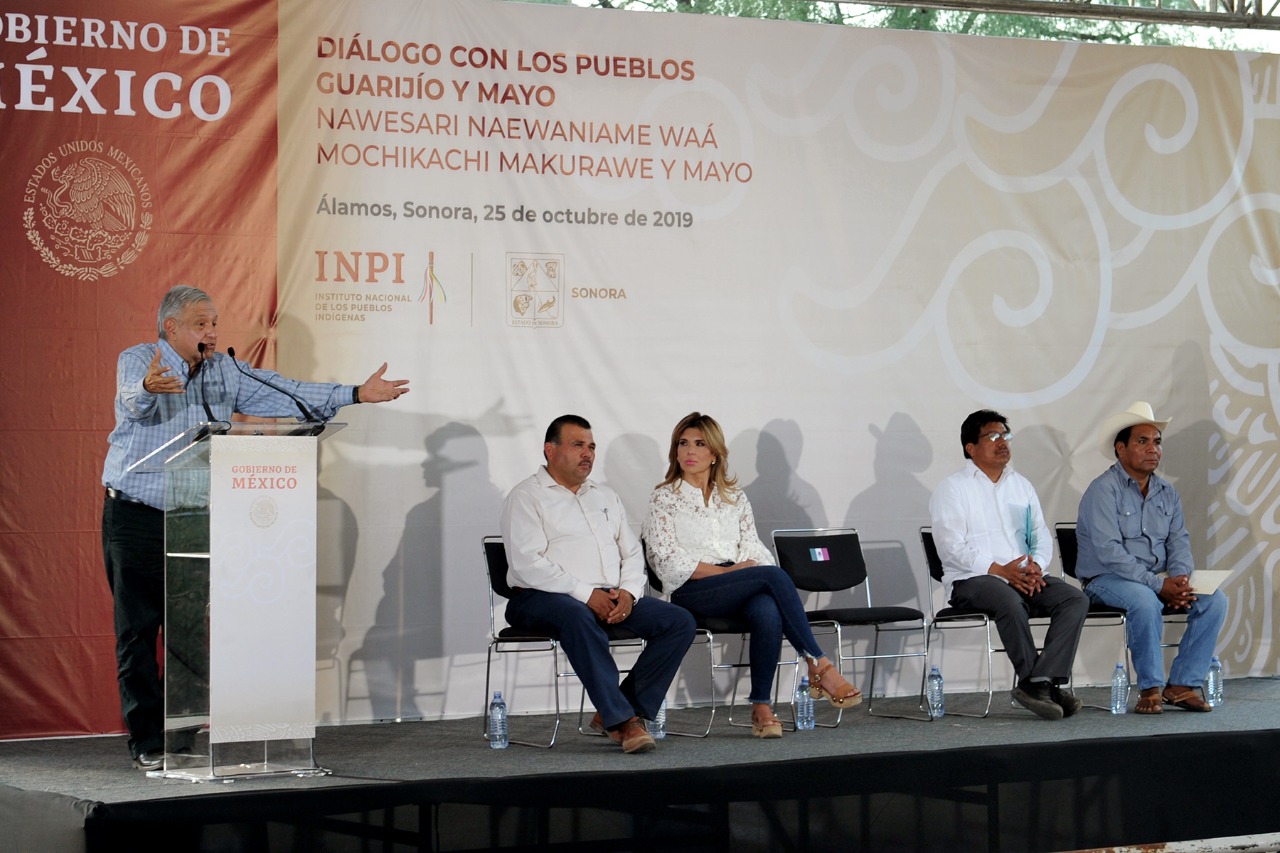 Durante el encuentro, el presidente de México reafirmó su compromiso con los integrantes de las etnias sonorenses de llegar a cumplir con el 100 por ciento de los apoyos sociales federales para la educación, adultos mayores, personas con discapacidad y jóvenes que se capacitan y se desarrollan en las empresas.