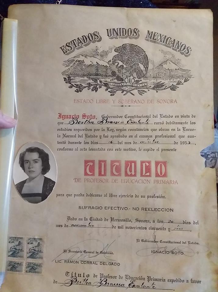 Cananea, Sonora a 06 de Noviembre de 2019.- Entre recuerdos, añoranzas sus consentidas mascotas un ayer y un presente entrelazados, documentos y títulos que avalan su preparación y desempeño profesional, así fue Bertha Brassea y así se le recuerda por su disciplina su manera positivamente estricta y su deseo de que las generaciones trasciendan en el conocimiento.