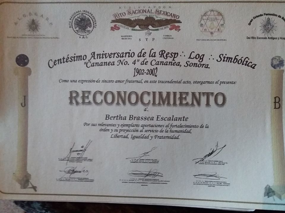 Perteneciente a la logia femenil del Rito Escoces Antiguo y Aceptado llegando a grado 3 donde se le otorga reconocimiento en el centésimo aniversario como una expresión de sincero amor fraternal por sus relevantes y ejemplares aportaciones al fortalecimiento de la orden y su proyección al servicio de la humanidad permaneciendo “en sueños” por un largo período.