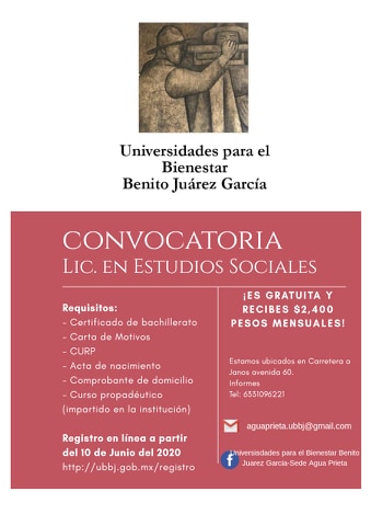 Agua Prieta, Sonora a 09 de julio de 2020.- Aún sigue abierta la convocatoria para estudiantes de la región que recién han concluido sus estudios en nivel medio superior, para que ingresen y se inscriban en la Universidad Benito Juárez, plantel Agua Prieta.
