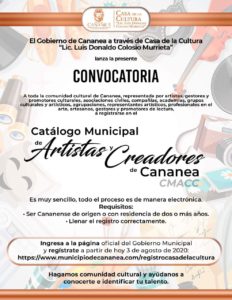 – El Gobierno Municipal de Cananea a través de Casa de la Cultura Lic. Luis Donaldo Colosio, lanzó una convocatoria, dirigida a toda la comunidad cultural de Cananea, representada por artistas, gestores y promotores culturales, asociaciones civiles, compañías, academias, grupos culturales y artísticos, agrupaciones, representantes artísticos, profesionales en el arte, artesanos, gestores y promotores de la lectura.
