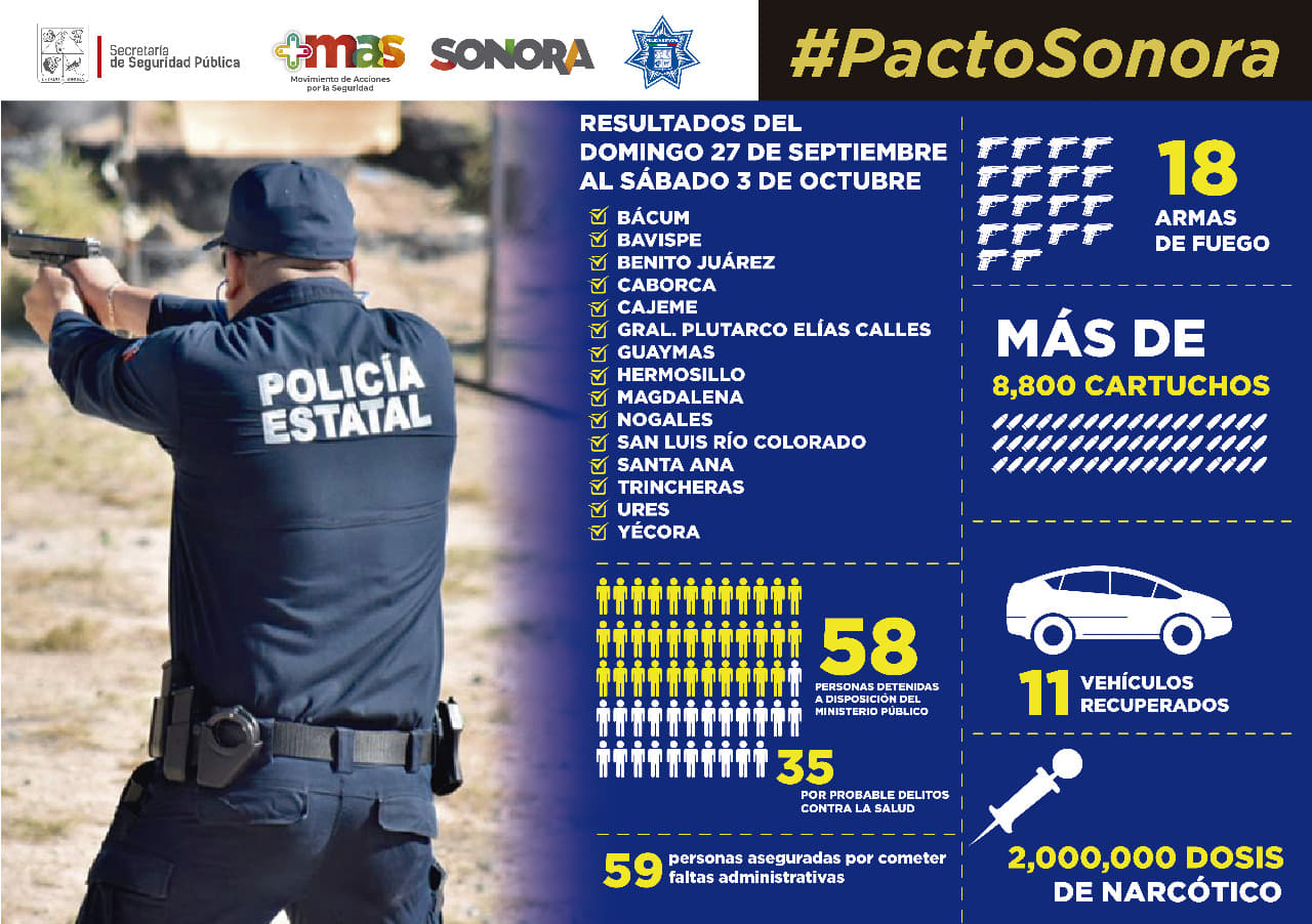 Estos resultados fueron en operativos efectuados en Hermosillo, Cajeme, Magdalena, Santa Ana, Bácum, San Luis Río Colorado, Nogales, Bavispe, Trincheras, Benito Juárez, Ures, Guaymas, General Plutarco Elías Calles, Caborca y Yécora.