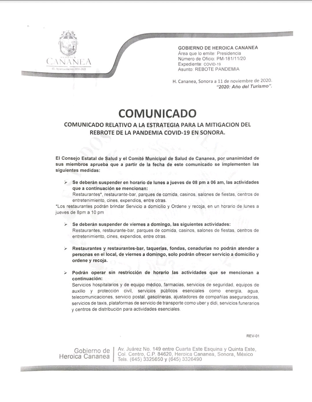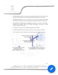Cananea, Sonora. – El Consejo Estatal de Salud y el Comité Municipal de Salud de Cananea, por unanimidad de sus miembros aprueba que a partir de la fecha de este comunicado se implementen las siguientes medidas: