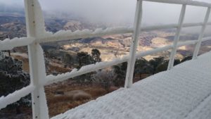 Cananea, Sonora a 29 de diciembre de 2020.- Tras la entrada del frente frío número 24 y condiciones que generaron la Cuarta tormenta invernal de la temporada, se registraron temperaturas congelantes sobre todo en la parte alta de la sierra La Mariquita, que embellecieron como siempre el paisaje que rodea al Observatorio Astrofísico Guillermo Haro, ubicado a 2480 metros sobre el nivel del mar.