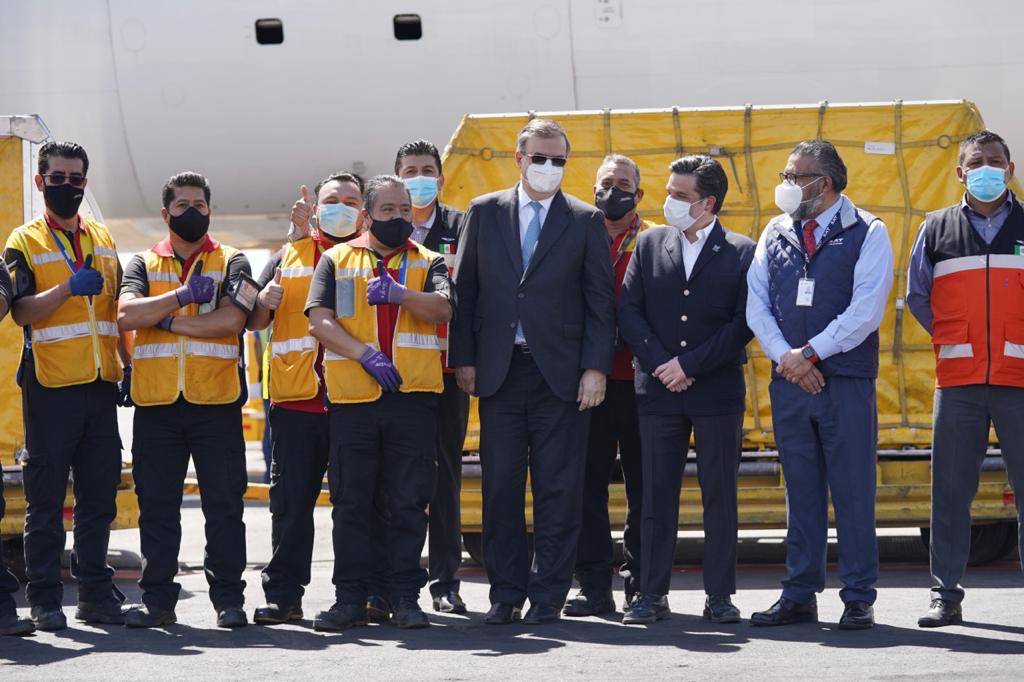 Ciudad de México, martes 16 de febrero de 2021.- El director general del Instituto Mexicano del Seguro Social (IMSS), Maestro Zoé Robledo, junto con el secretario de Relaciones Exteriores (SRE), Marcelo Ebrard Causaubón y el administrador de Aduanas del Sistema de Administración Tributaria (SAT), Horacio Duarte, recibieron el séptimo embarque de vacunas de la farmacéutica Pfizer contra COVID-19 en el Aeropuerto Internacional de la Ciudad de México.