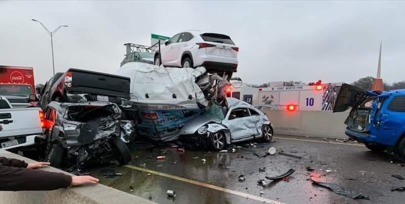 Fue en la carretera I-35 W al norte de Fort Worth donde alrededor de 100 vehículos colisionaron ocasionando un enorme bloqueo en la vía, de acuerdo a reportes preliminares la presencia de hielo en el asfalto podría haber sido la causa principal.