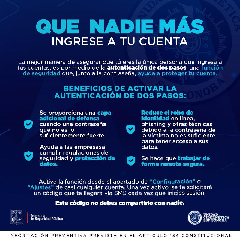 Hermosillo, Sonora; marzo 23 de 2021. Utilizar un doble factor de autenticación para prevenir que delincuentes cibernéticos realicen un posible hackeo de cuentas de correo electrónico y redes sociales, recomienda la Unidad Cibernética de la Secretaría de Seguridad Pública (SSP).