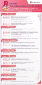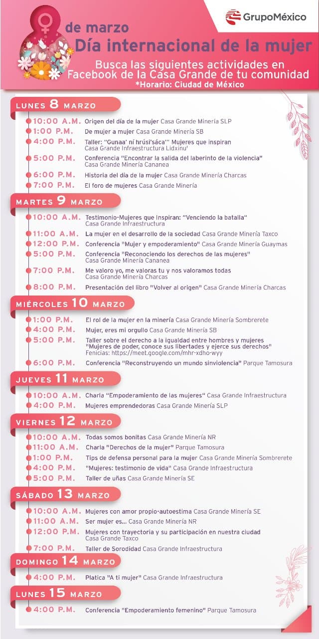 En el marco del día internacional de la mujer, Grupo México a través de su área de Desarrollo Comunitario Casa Grande, preparó un programa de talleres, foros y conferencias virtuales del 08 al 15 de marzo del presente año, actividades que vengan a conmemorar el papel de la mujer en la sociedad, tanto en el aspecto laboral, equidad de género, emprendimiento, su papel responsable durante toda la pandemia y los esfuerzos que se han hecho para poder superar los retos o tabús que la misma sociedad fue poniendo en el subconsciente colectivo.