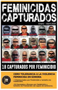 Hermosillo, Sonora, mayo 03 de 2021. Con claras políticas públicas de erradicación de la violencia contra las mujeres y las niñas, y de cero tolerancia a la violencia feminicida, la Fiscalía General de Justicia del Estado de Sonora (FGJE), reporta que, en el período del 1° de enero al 30 de abril del presente año, se han registrado 13 feminicidios, se han sido capturados 18 agresores por este delito, tanto involucrados en hechos del año actual como de años anteriores; esta contabilidad incluye expedientes que son juzgados en el sistema tradicional y otros del sistema oral penal.